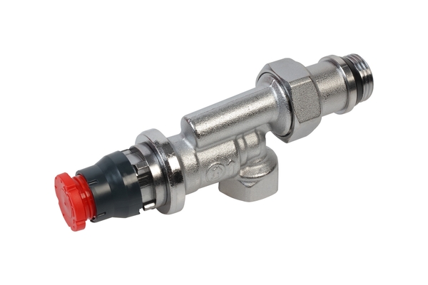 Termostatický ventil, automatická regulace průtoku, rohový, osa hlavy přímá, s víčkem, gumové těsnění. Pro hlavy se systémem CLIP - CLAP.