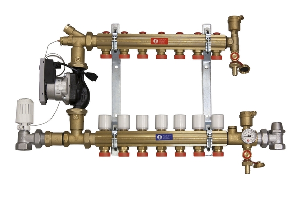 Směšovací rozdělovač pro podlahové vytápění s vysokoteplotními zdroji, termostatická regulace, s elektronickým čerpadlem WILO PARA. Skříň není součástí.